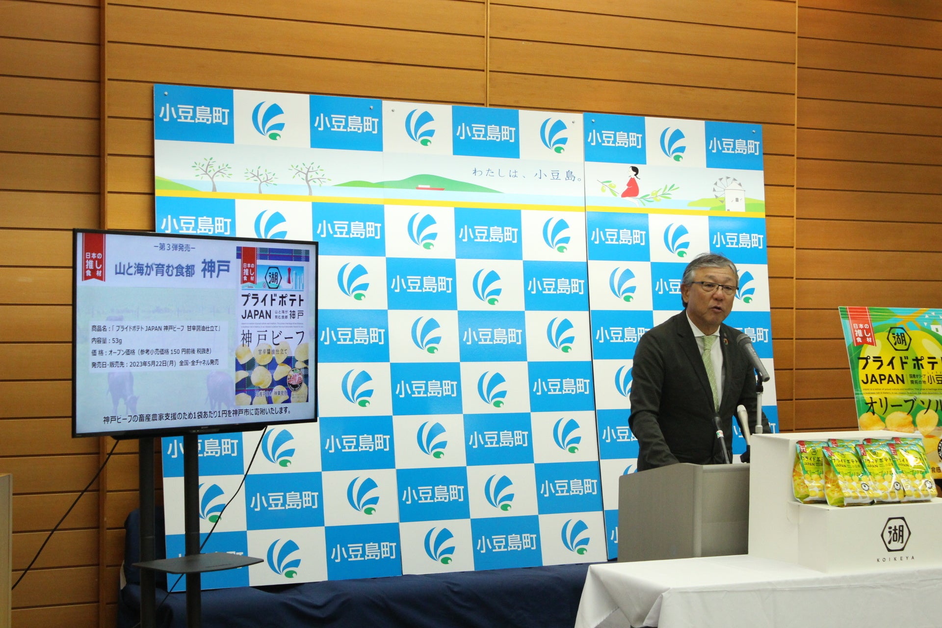 「湖池屋 JAPAN PRIDE プロジェクト」の開始から6年目を迎える今年は、これまで以上にスケールアップをして、地域を超えた作り手のみなさまの“プライド(素材にかけるこだわりや想い)”をより広く全国のみなさまへ伝えていきたいとの思いから、これまで「JAPANプライドポテト」として展開してきた各地を繋ぐ初めての試みとして、「神戸」・「小豆島」の魅力が詰まった2商品を同時に発売いたしましたが、2年ぶりの商品化となった「湖池屋プライドポテト JAPAN 神戸ビーフ」の発売を神戸市ならびに神戸肉流通推進協議会の方々へご報告させていただくべく、発売日となります2023年5月22日(月)に神戸市役所に表敬訪問を実施しました。