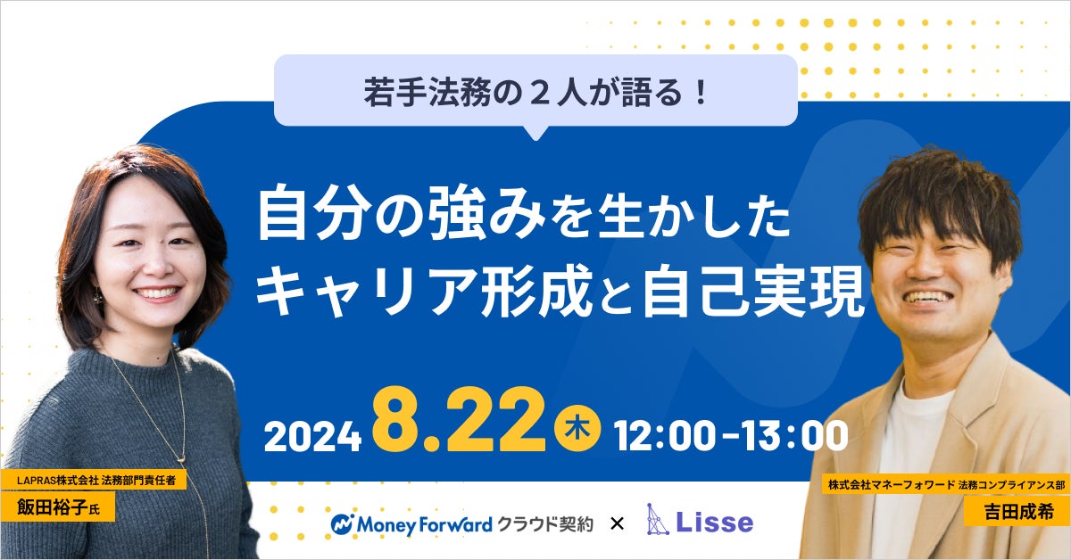 株式会社マネーフォワードは、ワンストップ契約管理サービス『マネーフォワード クラウド契約』を検討中の法人や法務担当者に向けて、2024年8月22日(木)にオンラインセミナー「若手法務の2人が語る!自分の強みを生かしたキャリア形成と自己実現」を開催します。