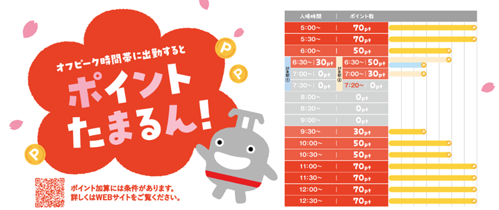 第3弾の効果検証の結果では、1日平均約1,000名のお客さまが新たにオフピーク時間帯に移行(全線で約1%の混雑率緩和に相当)し、サービス終了後も多くのお客さまにオフピーク通勤を継続いただいていることが確認できました。また、若年層や女性の利用が増加し、特に朝のピーク時間帯後においては、その傾向がより顕著であることが分かりました。これを踏まえ、幅広い年代のお客さまにご参加いただけるよう、第3弾に引き続き、朝のピーク時間帯前(始発~7:00または7:20)だけでなく、ピーク時間帯後(9:30~13:00)にご乗車いただいた方もポイント加算の対象とします。