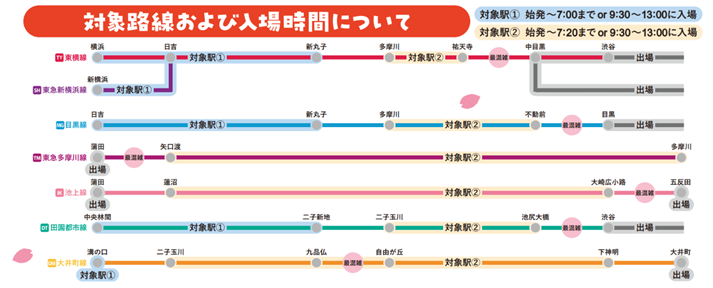 対象駅②は初電から7時20分まで、もしくは9時30分から13時00分までに自動改札機から入場した場合が本サービスのポイント加算対象となります。路線ごとの詳細は以下をご確認ください。