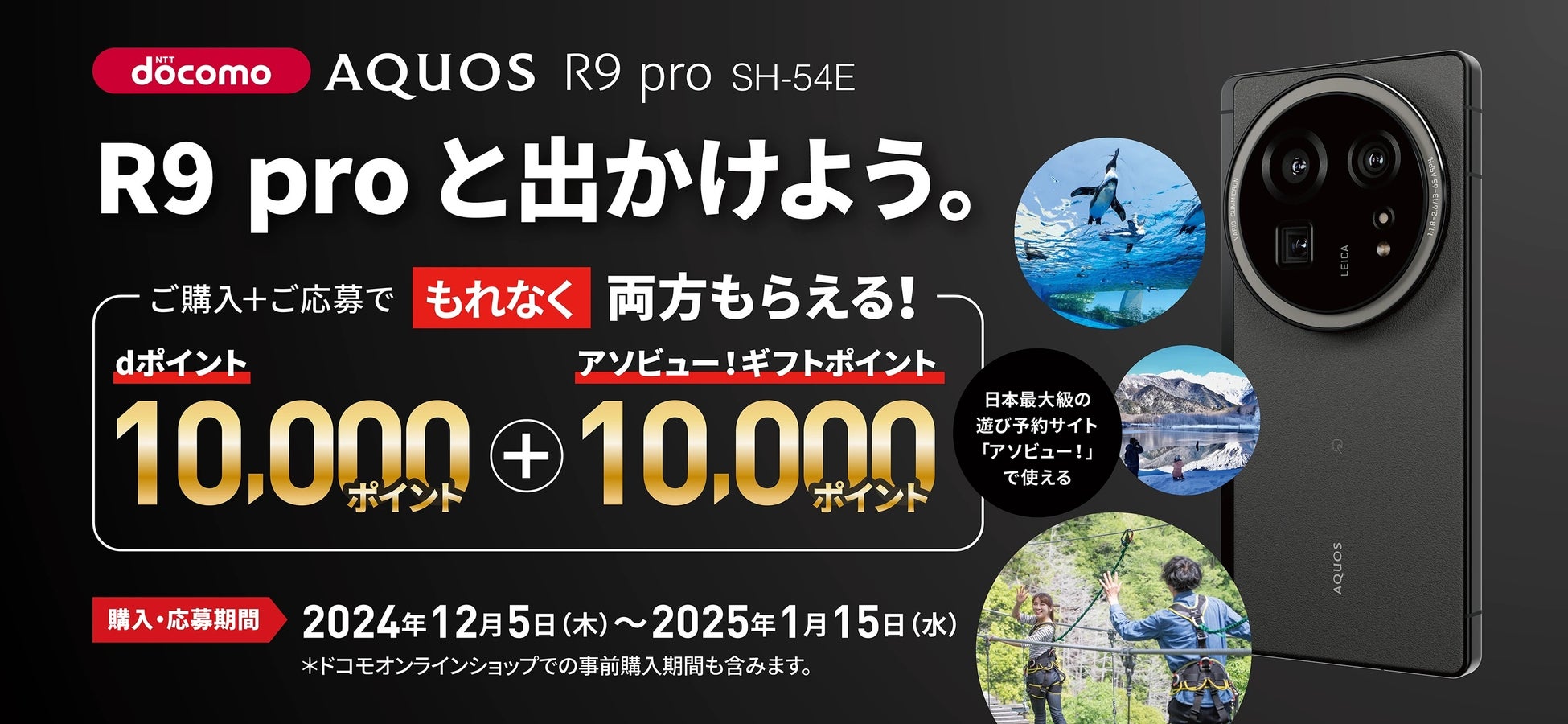 2024年12月5日(木)~2025年1月15日(水)の期間中にNTTドコモ「AQUOS R9 pro」<SH-54E>をご購入の上、キャンペーンサイトからご応募いただいたお客様にもれなく、dポイント10,000ポイントとアソビュー!ギフトポイント10,000ポイントの両方をプレゼントします。アソビュー!は、日本全国のレジャー施設や遊びの体験プランをWeb上で簡単に検索・予約できるサイトです。