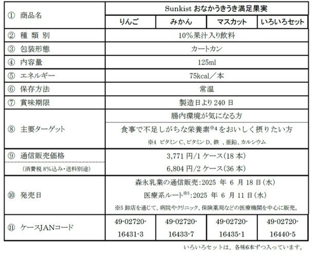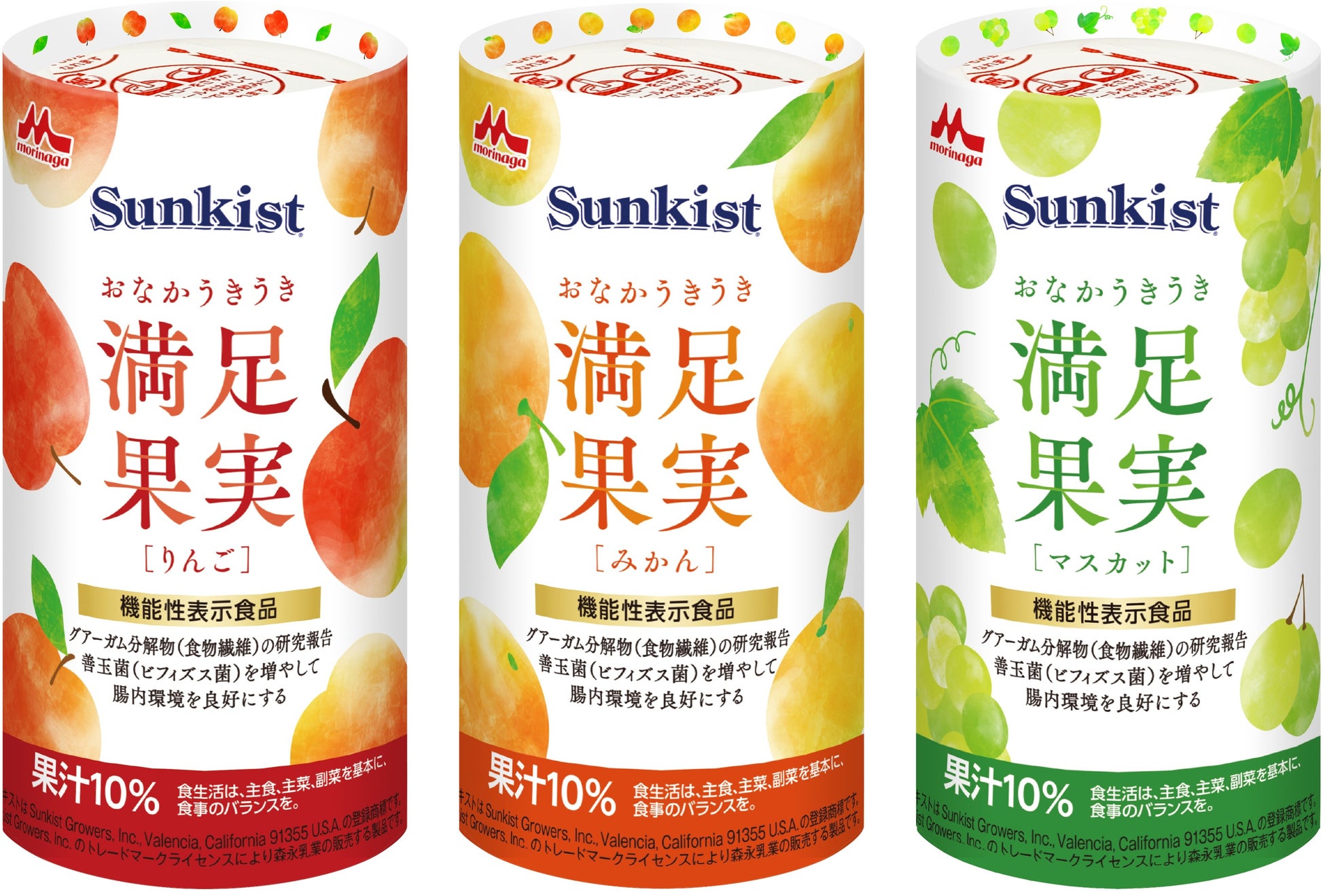 森永乳業クリニコ株式会社は、2025年6月11日(水)より機能性表示食品「Sunkistおなかうきうき満足果実 りんご」「Sunkistおなかうきうき満足果実 みかん」「Sunkistおなかうきうき満足果実 マスカット」の栄養補助飲料3種類および、3種類を詰め合わせにした「Sunkistおなかうきうき満足果実 いろいろセット」を新発売いたします。