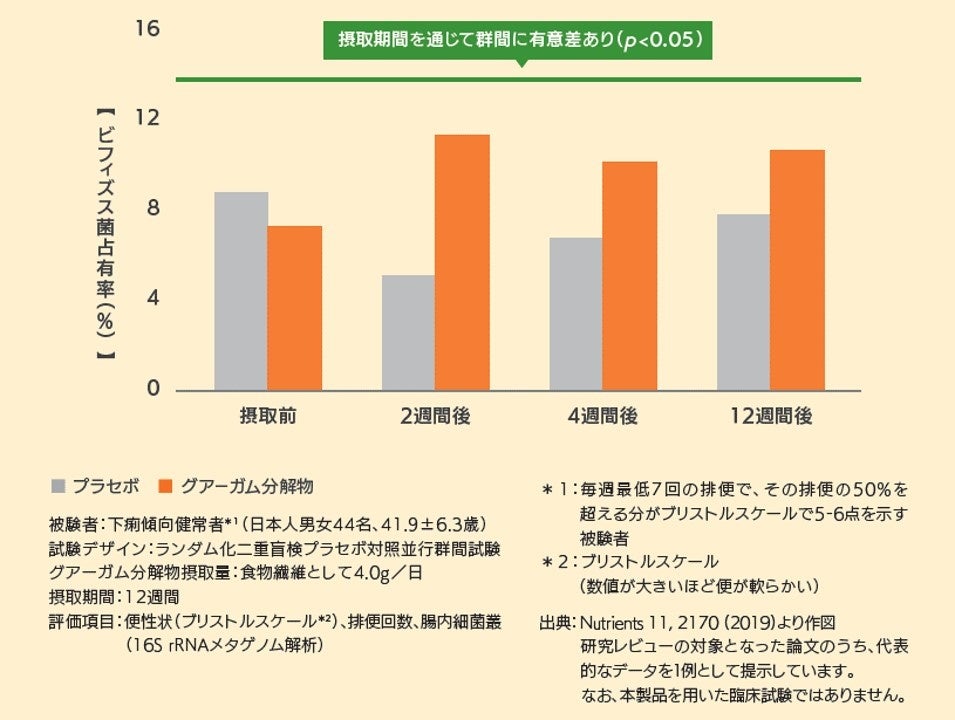 善玉菌(ビフィズス菌)を増やして腸内環境を良好にする機能が報告されたグアーガム分解物(食物繊維)を配合