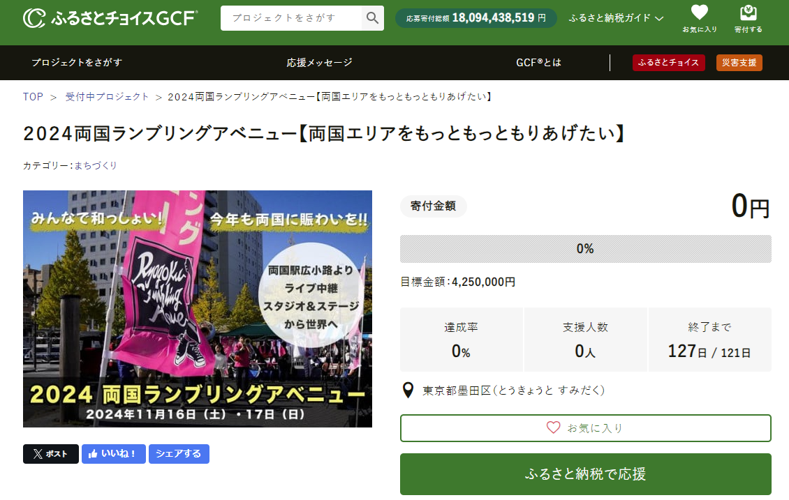 「2024両国ランブリングアベニュー【両国エリアをもっともっともりあげたい】」プロジェクトは、両国の魅力を世界中に継続的に発信するイベント「2024両国ランブリングアベニュー」のイベント運営費用に活用します。