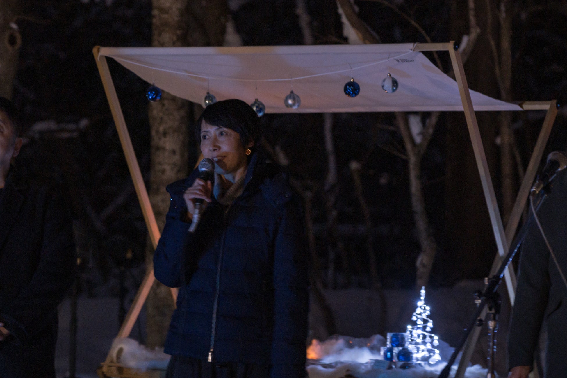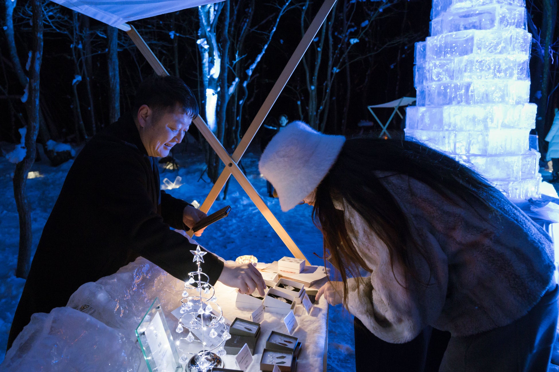 点灯式にあたって、当イベントオリジナル商品の制作に携わった地域の事業者が、その制作秘話を語りました。津軽塗を用いて氷瀑アクセサリーを作成した津軽塗(*3)ブランド「KABA」の佐々木さんは、「漆は通常飴色で、津軽塗りの技法を用いて氷瀑の透明感を表現しました。光の強さや角度によって輝きが変わるので合わせてお楽しみいただけますと嬉しいです。」とコメントしました。また、「ripples」小林さんは「氷瀑をモチーフとした商品が皆様の記念の品となれば嬉しいです」と感想を語り、奥入瀬渓流の冬の風物詩を掛け合わせた地域の魅力を伝えました。