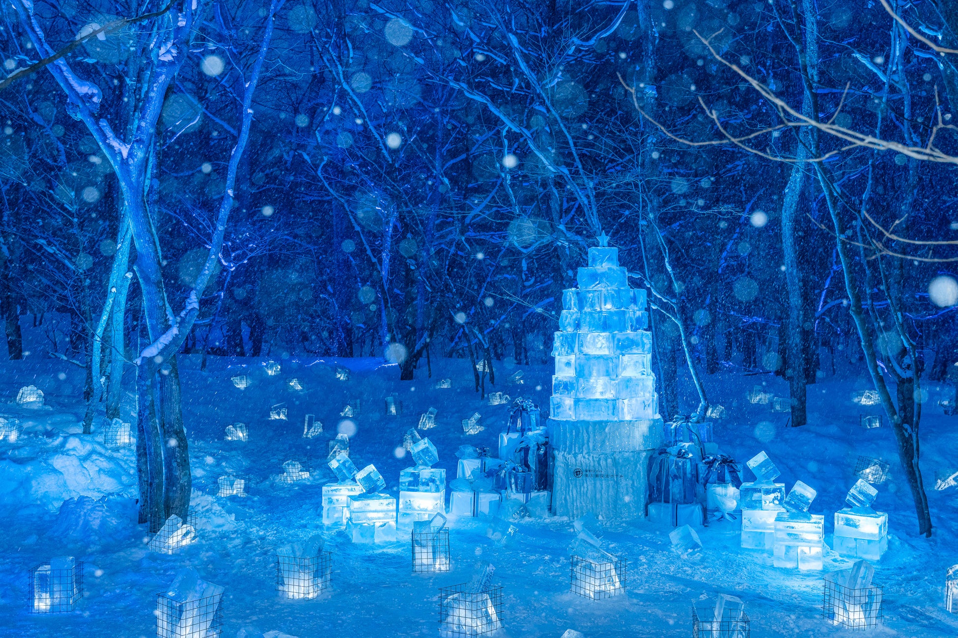 奥入瀬渓流の風物詩である「氷瀑」をテーマにした、クリスマスイベントです。高さ3.5mの氷瀑クリスマスツリーと、氷瀑の造形美を再現した氷瀑ランタンが、幻想的な景色を作り上げます。アイスブルーと白の氷瀑をイメージしたコスチュームをまとった氷瀑サンタクロースや、氷瀑をイメージしたクリスマスケーキが登場し、氷瀑づくしのクリスマスを楽しめます。