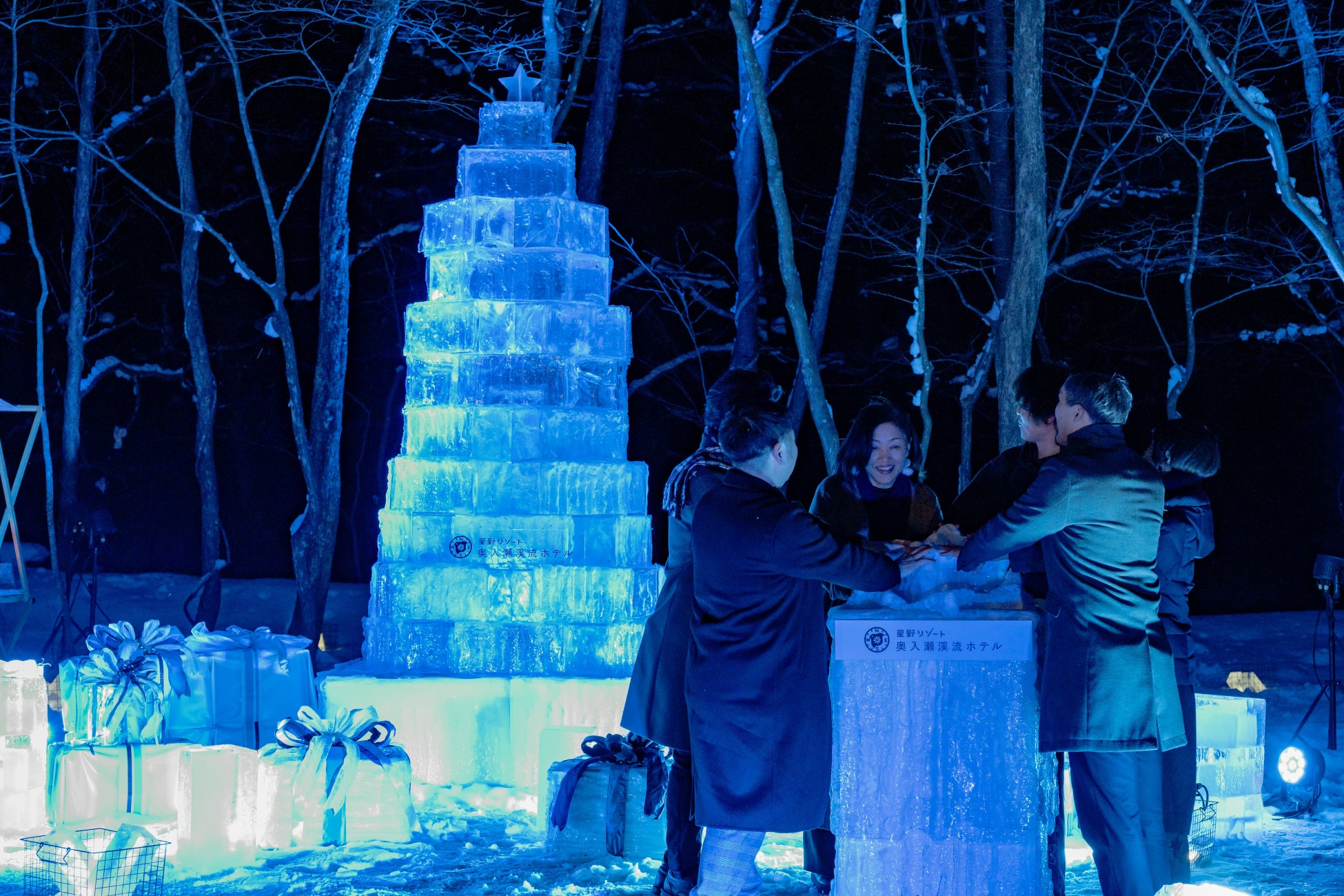 奥入瀬(おいらせ)渓流沿いに建つ唯一のリゾートホテル「星野リゾート 奥入瀬渓流ホテル」では、2024年12月9日に、氷瀑を満喫するクリスマスイベント「氷瀑クリスマス」の開始に合わせ、高さ3.5mのイベントシンボル、氷瀑クリスマスツリーの点灯式を実施しました。当日参加したのは、宿泊者30名とオリジナルアイテムの制作に携わった地域の事業者です。カウントダウンの声にあわせ青く幻想的に照らし出されたクリスマスツリーに、歓声が上がりました。参加者は心も体も温まるホットドリンクを飲みながら、非日常感溢れる空間で特別なひとときを過ごしました。