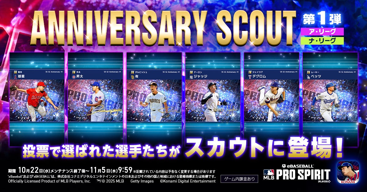 株式会社コナミデジタルエンタテインメントは、モバイルゲーム『eBaseball™: MLB PRO SPIRIT』(以下、『メジャスピ』)が配信開始から1周年を迎えることを記念して、本日10月22日(水)に無料アップデートを実施しました。