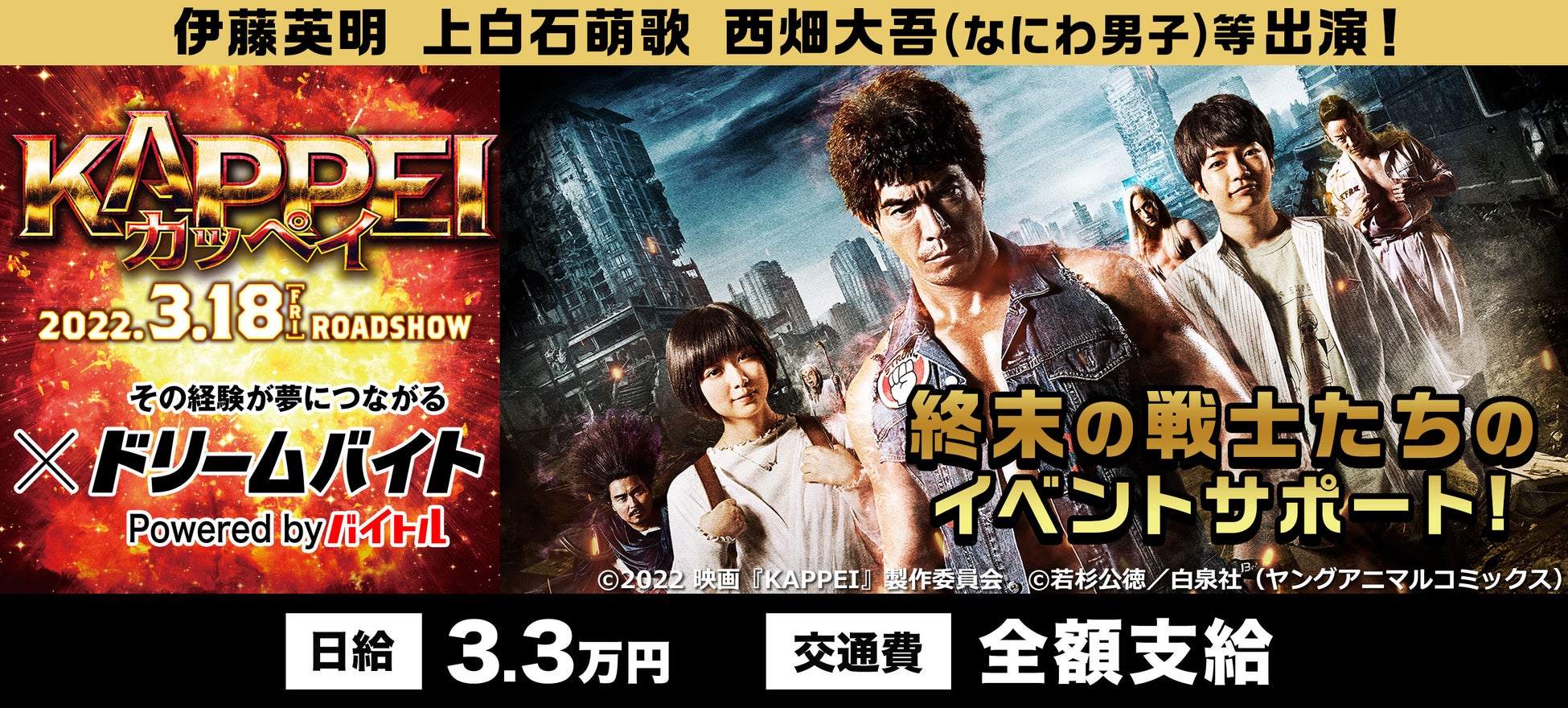 今回のドリームバイトでは、映画『KAPPEI カッペイ』のイベントで、“終末の戦士”たちをサポートする救世主(アルバイト)を募集いたします。勤務日は、2022年3月中旬を予定。募集人員は合計2名、報酬として日給3.3万円をご用意。交通費は全国どこでも全額支給いたします。映画イベントの現場に興味がある方や、終末の戦士たちをサポートしたい方など、みなさまのご応募をお待ちしております。