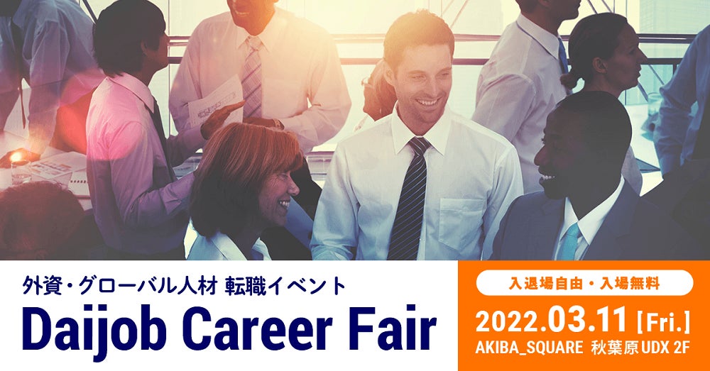 | ■外資・グローバル人材のための転職イベント「第43回Daijob Career Fair」を2022年3月11日(金)、AKIBA_SQUARE(東京都:秋葉原)で開催 ■バイリンガル求人が増加傾向にある中、外資系・グローバル企業の採用担当者と直接対面することで、グローバル人材の転職機会を効率的に提供 ■グローバル人材向けに有識者によるビザ手続きなどの転職に役立つセミナーも実施 |
