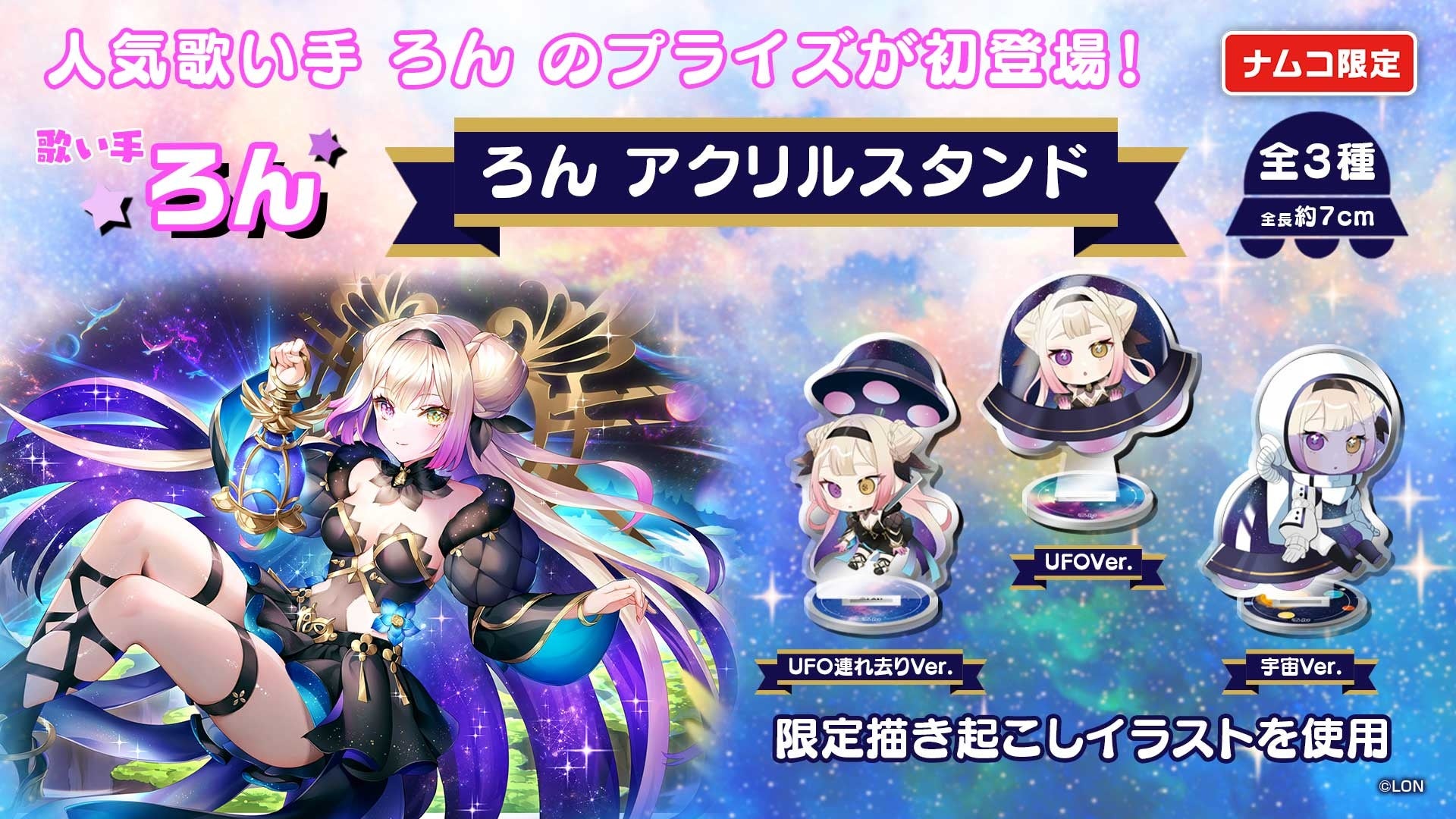 宇宙空間にいる「ろん」がコンセプトの限定描き起こしイラストを使用した、コレクションしたくなるミニアクリルスタンドです。