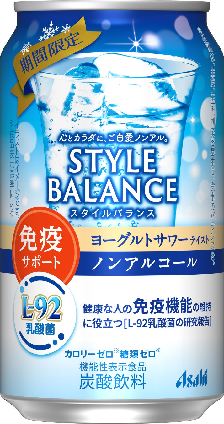 『アサヒスタイルバランス免疫サポートヨーグルトサワーテイストノンアルコール』は、「カルピス」に由来する長年の乳酸菌研究により選び抜かれた「L-92乳酸菌」を配合した機能性表示食品です。「L-92乳酸菌」は、健康な人の免疫機能の維持に役立つ機能が報告されています。ブランドの特長である“アルコール分0.00%”“カロリーゼロ※2”“糖類ゼロ※2”はそのままに、ヨーグルトのほどよい甘みと酸味のある爽やかな味わいが楽しめます。パッケージは青と白をベースにすることで、爽やかな味わいを表現するとともに冬らしいデザインにしました。「免疫サポート」と「L-92乳酸菌」のアイコンを記載し、おいしさと機能を両立した商品特長を訴求しています。