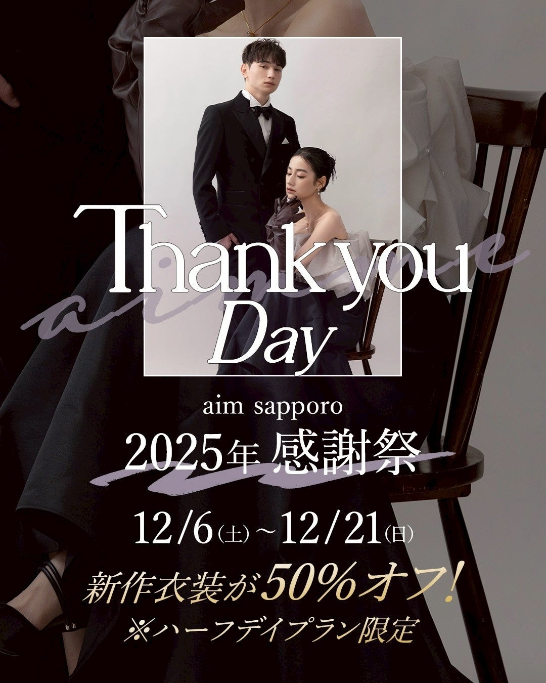 北海道札幌市のウエディングフォトスタジオ、aim/aimme札幌店から2025年の感謝を込めて、『aim/aimme感謝DAY』が開催中。