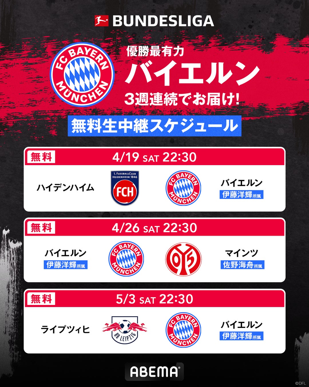 「ABEMA」では、そんな注目の優勝争いに直接関わる形で行われるバイエルンの試合を、4月19日(土)のアウェイ・ハイデンハイム戦、4月26日(土)のホーム・マインツ戦、そして5月3日(土)のアウェイ・ライプツィヒ戦と、重要な3試合すべてを無料生中継します。