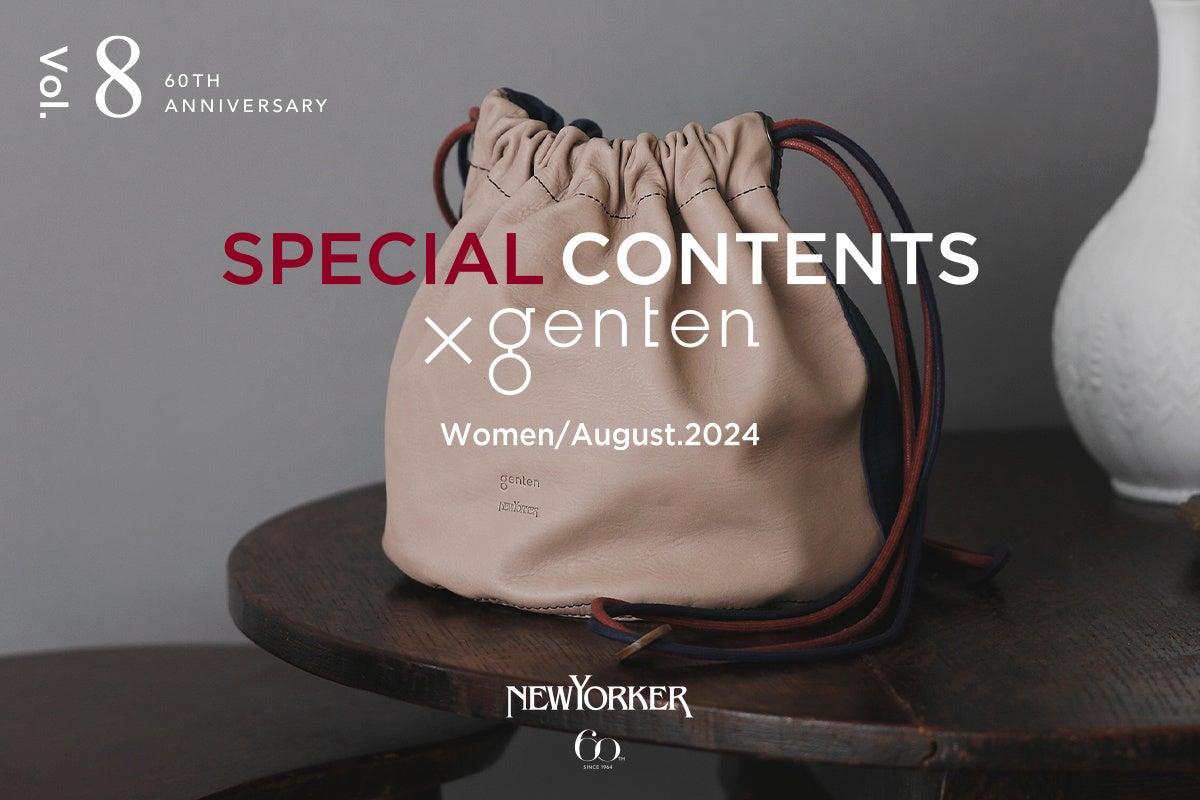 ブランド設立60 周年を記念してNEWYORKER ウィメンズでは、24年春夏コレクションに続き【genten】とのコラボレーションが実現。今回のコラボレーションでは、「巾着バッグ」を展開。バッグを作製する際に出てしまう“残革”を再利用し、ランダムなシワやキズも本来の魅力として捉えたアイテム。バイカラーはNEWYORKERとのコラボでしか手に入らない特別なデザインです。