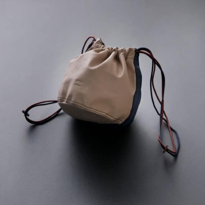 今回は、カーフ革を余すことなく裁断することで、シワやキズも天然素材ならではの“味”として愉しんでいただけるサステナブル巾着バッグを作製。ニューヨーカータータンをイメージした本体のバイカラーと紐の組み合わせが、コラボレーション感をより一層高めるデザインに仕上がりました。サブバッグやバッグインバッグとしてもお使いいただける汎用性の高いアイテムです。