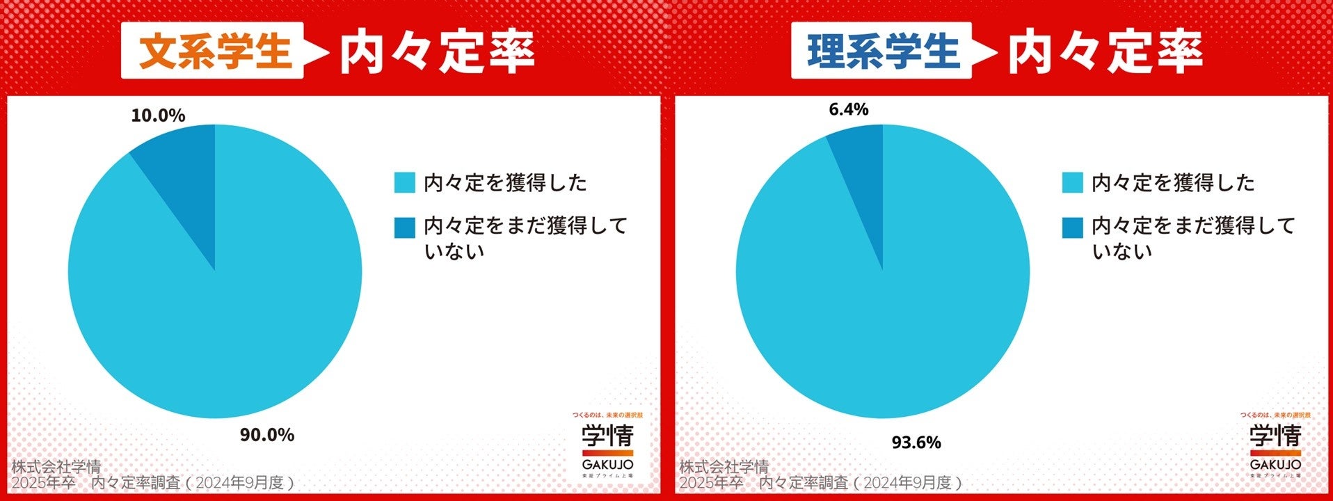 文理別では、文系が「90.0%」。文系の内々定率が90%台に乗ったのは今期初めてで、前月比6.3ポイント増と大きく伸びたのが目立ちます。一方、理系は「93.6%」で、前月比0.4ポイントの微増でした。