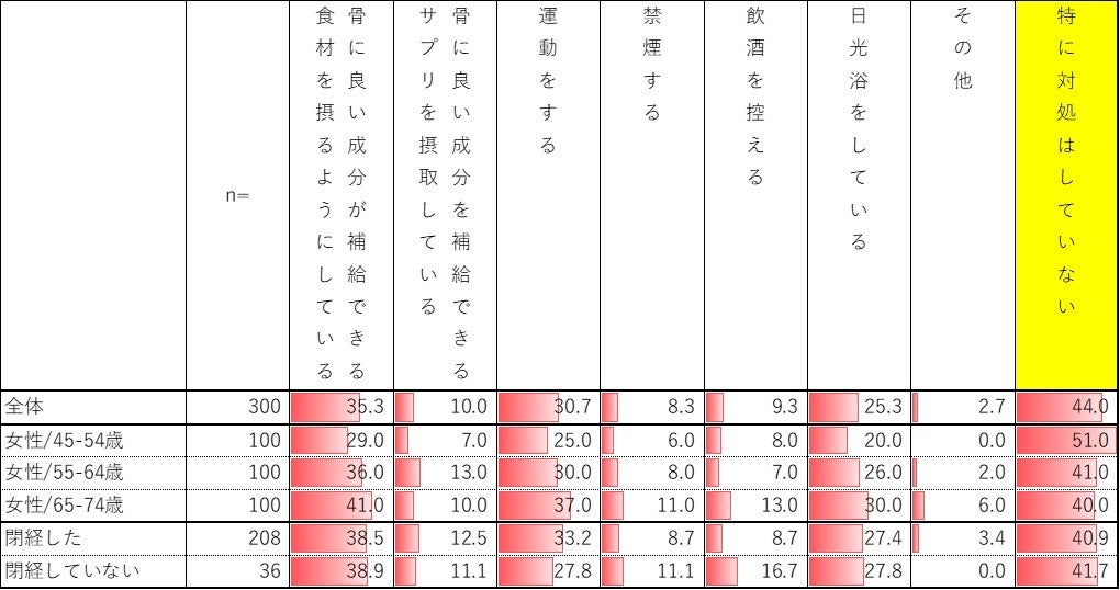 ■約半数の人が骨量や骨密度に対して「特に対処をしていない」。骨粗しょう症のリスクが高まる閉経後の女性も約4割が「特に対処をしていない」。