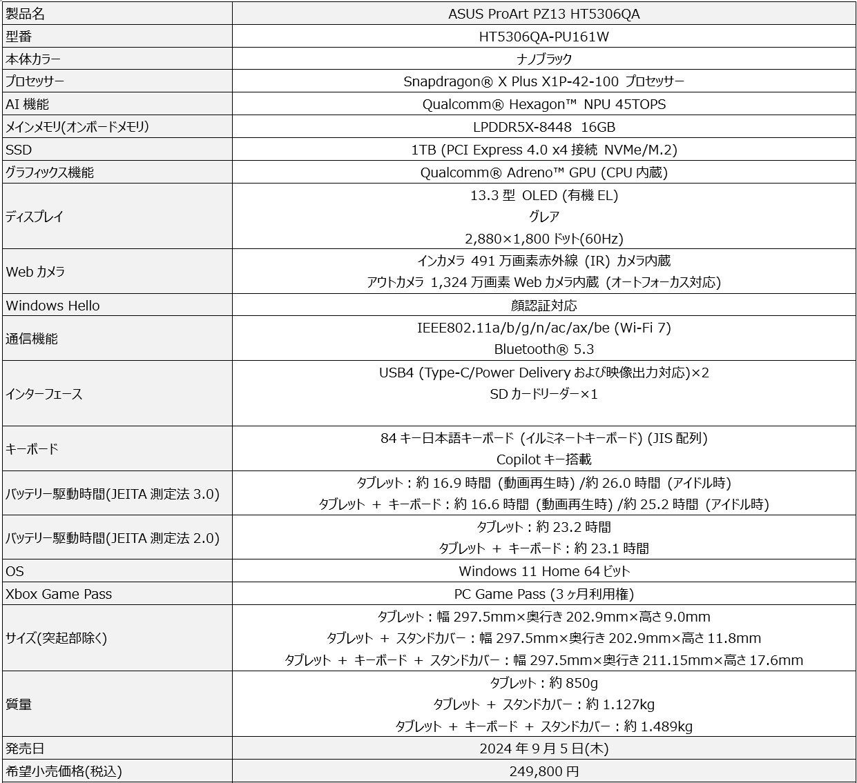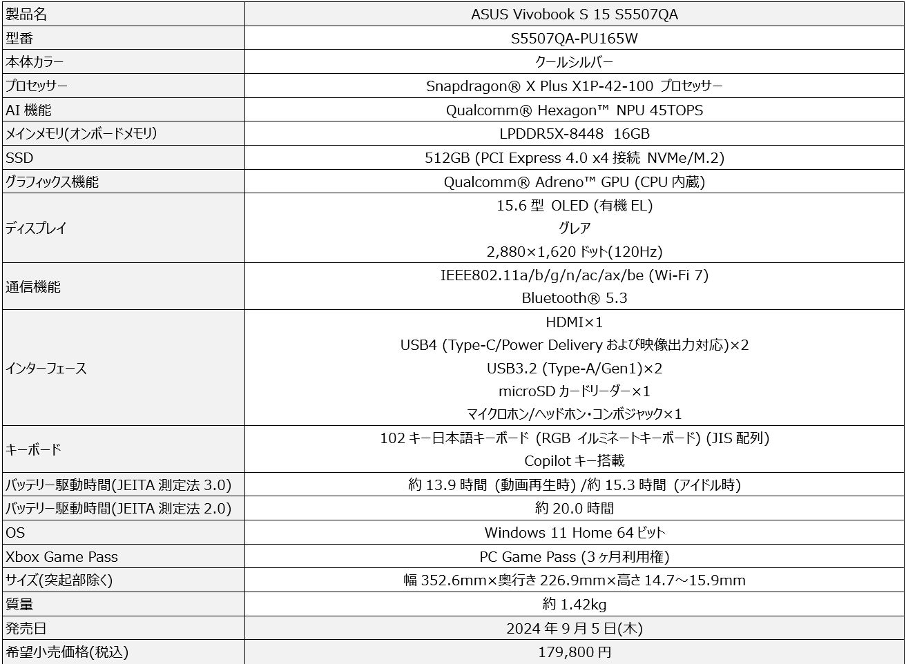 ASUS JAPAN株式会社はCopilot+ PCに対応する新しいCPU「Qualcomm® Snapdragon® X Plus X1P-42-100 プロセッサー」を搭載した、「ASUS Vivobook S 15 S5507QA」および「ASUS ProArt PZ13 HT5306QA」を発表いたしました。2024年9月5日(木)より販売開始となります。