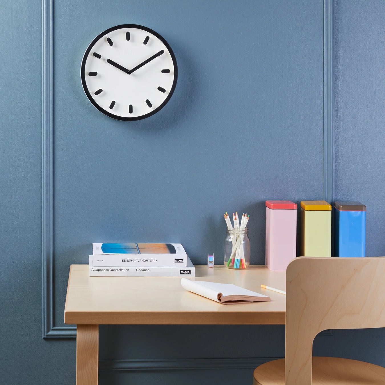 コンピューター画面の時計アイコンを具現化した、ユーモラスな壁掛け時計。深澤直人によるデザインで、丸みを帯びたアウトラインと浮き上がった時・分のマークは、漫画にインスパイアされています。斜めから見ると、文字盤のぷっくりとした厚みがさらにチャーミング。※10月発売