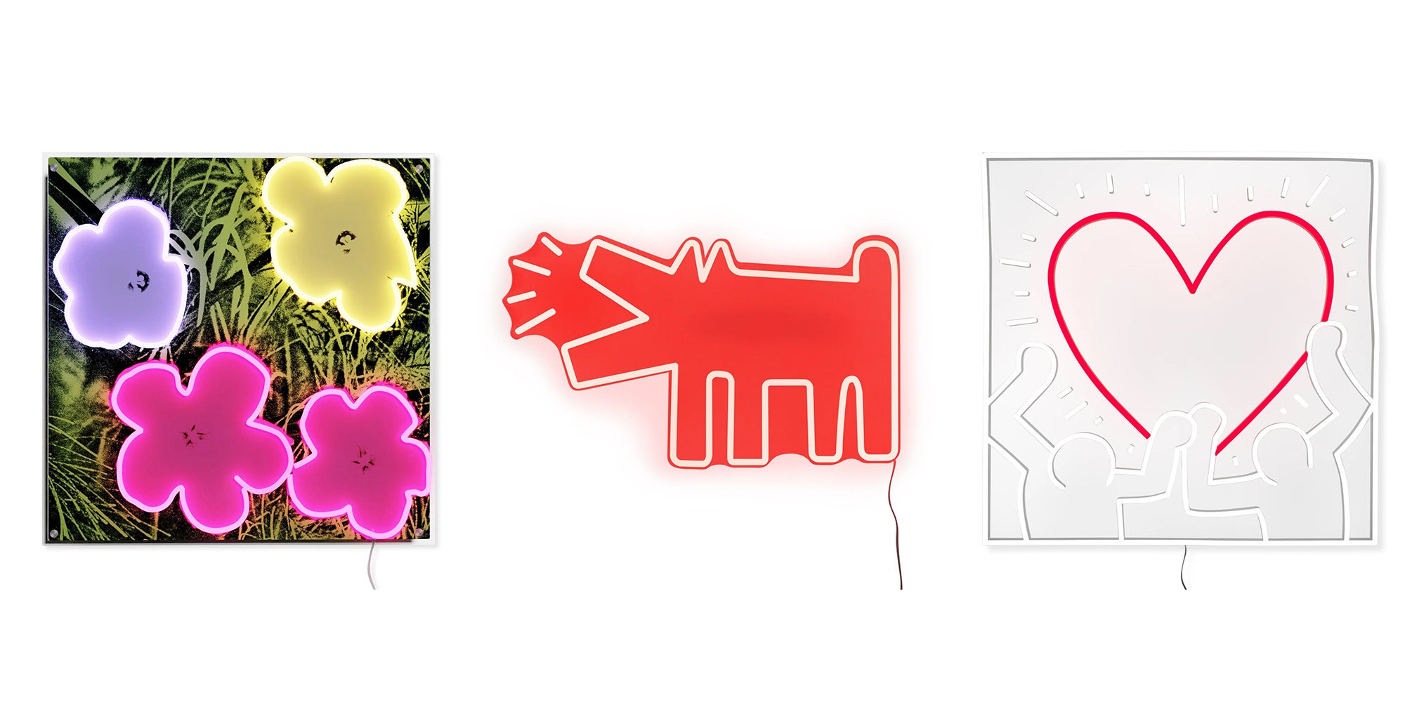 画像左から)アンディ・ウォーホル Flowers ネオンサイン 110,000円(税込)/キース・へリング Barking Dog ネオンサイン 84,700円(税込)/キース・へリング Radiant Heart ネオンサイン 242,000円(税込) ※すべて10月発売