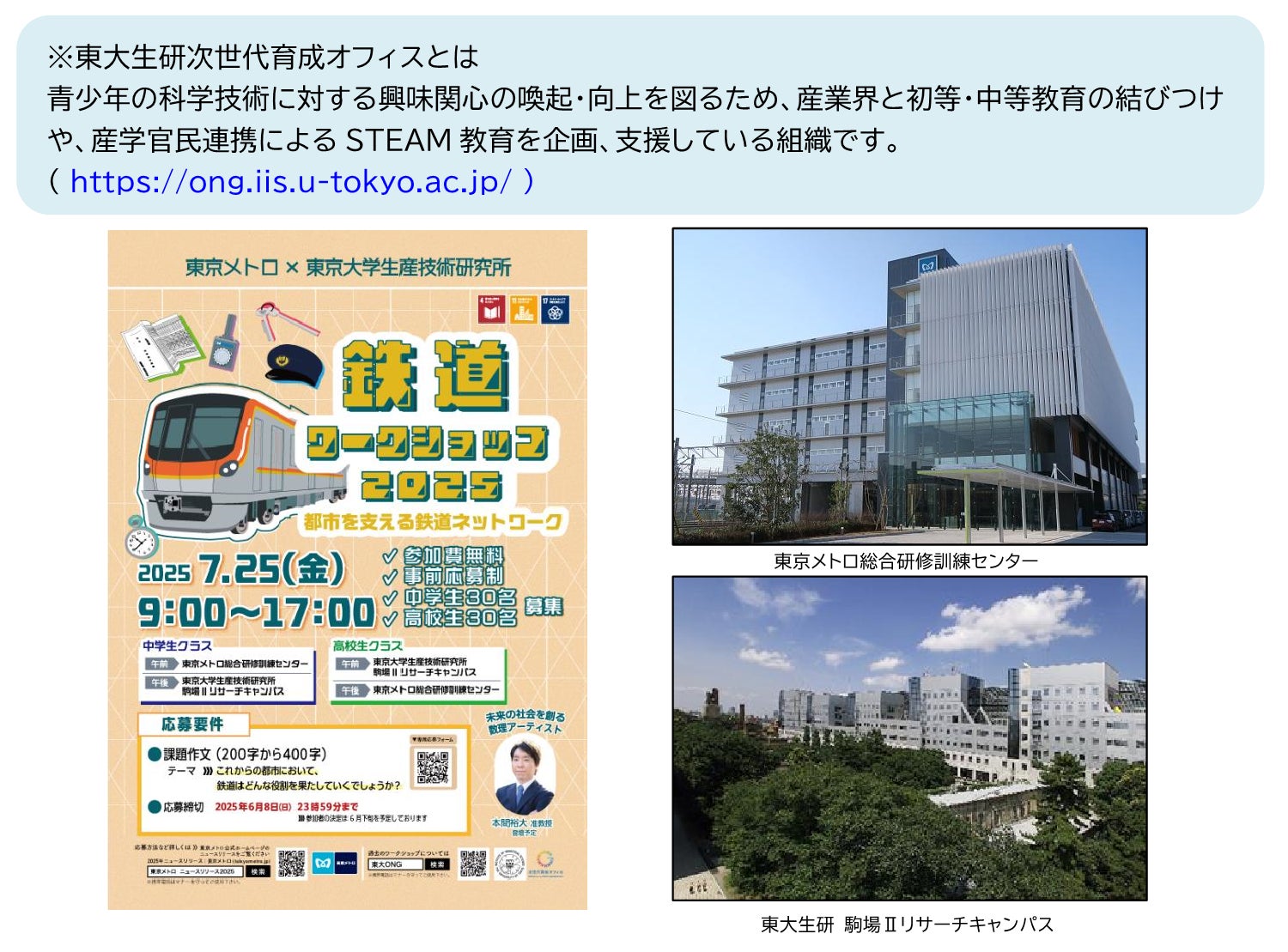 東京地下鉄株式会社(本社:東京都台東区、代表取締役社長:山村 明義、以下「東京メトロ」)と東京大学生産技術研究所(東京都目黒区、所長:年吉 洋、以下「東大生研」)は、「鉄道ワークショップ2025~都市を支える鉄道ネットワーク~」を2025年7月25日(金)に開催します。