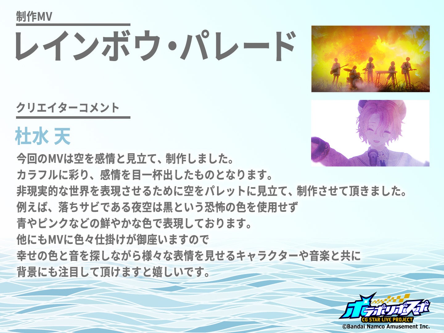 【空想・創造・共創】をキーワードとするポラポリポスポのコンセプトに基づき、未来ある若手クリエイターにMV映像制作を依頼しました。制作者名やコメントなどを公表することで、プロジェクトをさまざまな角度から支える各分野のパートナーに敬意を示します。また、制作の裏側を自ら発信することで、キャラクターに関わるプロの仕事の多様さを広く知ってもらうきっかけとなることを願い、今後のエンターテインメント業界のさらなる発展と継続可能な環境を目指しています。