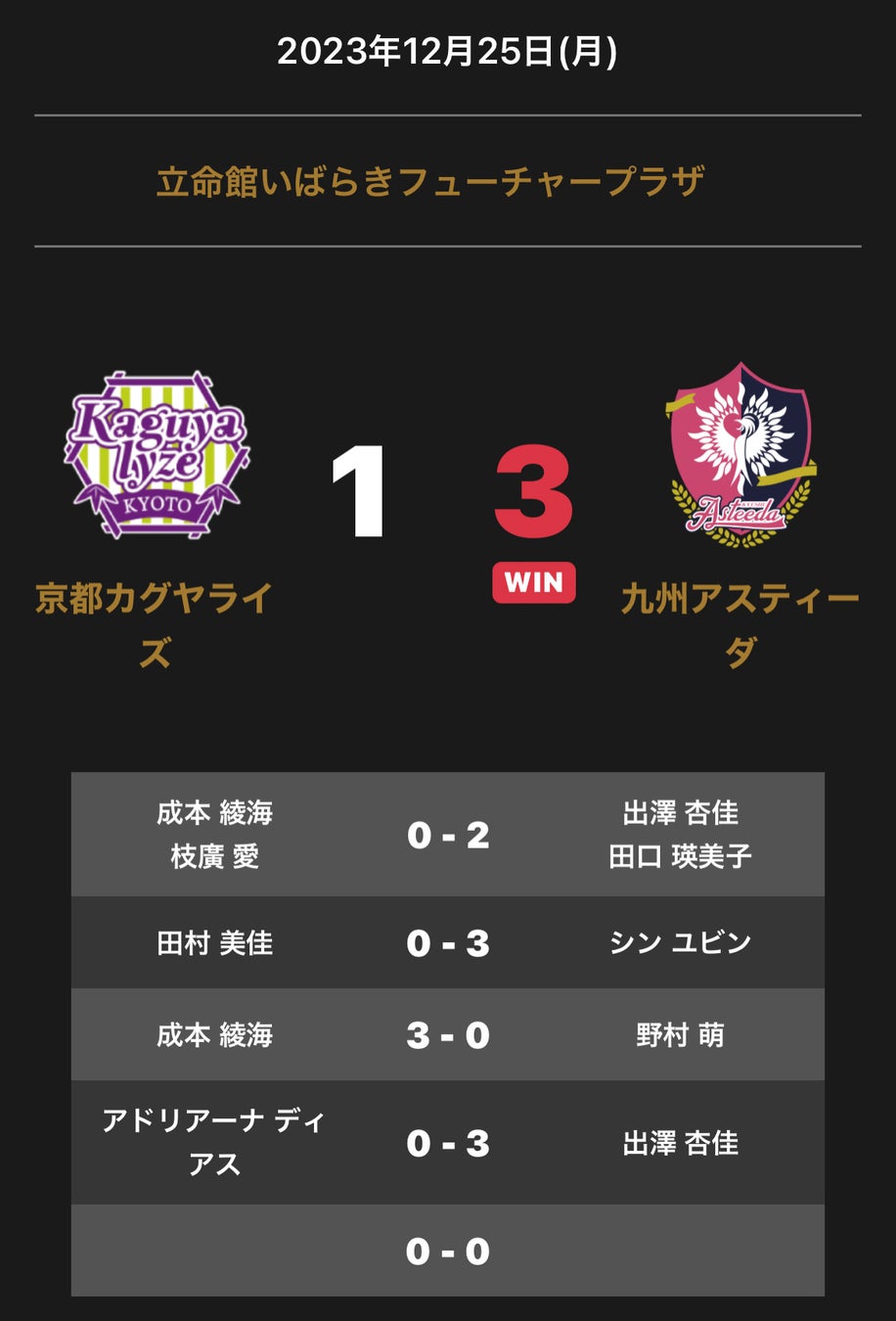 ノジマTリーグ 2023-2024シーズン 公式戦 12月25日開催 「京都カグヤライズ vs 九州アスティーダ」の試合は3-1で九州アスティーダが勝利しました。
