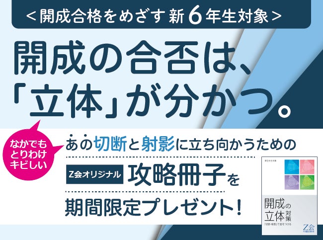 そこでZ会は、「切断」と「射影」の攻略開始に特化した冊子『<開成の立体>対策 ー切断・射影で差をつけるー』を、期間限定で、ご希望の新小学6年生全員にプレゼント!