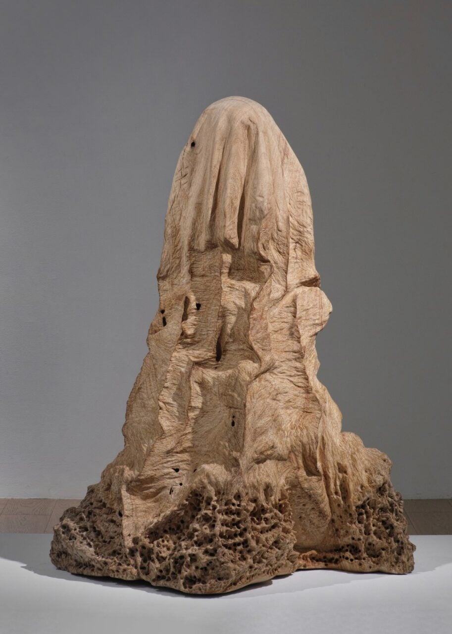 ◆膨大な蓄積を誇る木彫という分野で、何にも似ていない作品を新たに作り続けており独自の世界を切り開いている作家。枯れたバナナの茎と布を被った人物を掛け合わせた作品が近年の代表作であり、ここには静物/人物、隠れたもの/露出したもの、若さ/老いといった様々な二項対立が含まれている。