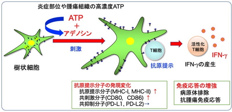 本研究では、高濃度のATPが、抗原提示を活性化する分子であるMHC分子の細胞表面への発現を上昇させることを見出し、さらにそのメカニズムとして、ATPとその代謝物であるアデノシンが協調して樹状細胞に作用することで、MHC分子の発現を上昇させることを明らかとしました。