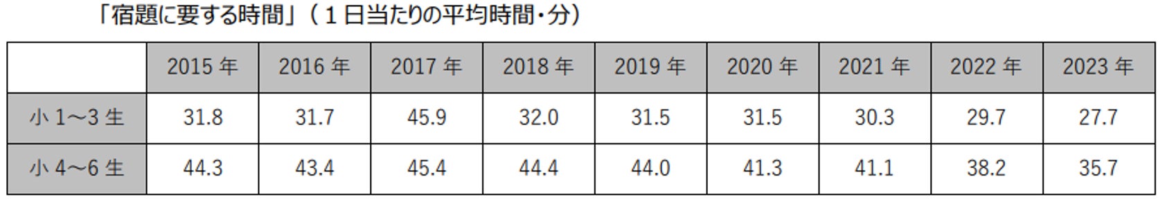 ベネッセ教育総合研究所が東京大学社会科学研究所と共同で実施している調査では、2015年~2023年までの9年間で小学生が「宿題」(夏休みに限らず「宿題」全般)にかける時間が、やや減少していました(※2)。実際に宿題は少なくなってきているといえるかもしれません。