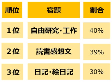 調査項目:夏休みの宿題で出ているもの、もっとも大変だと思う宿題、など