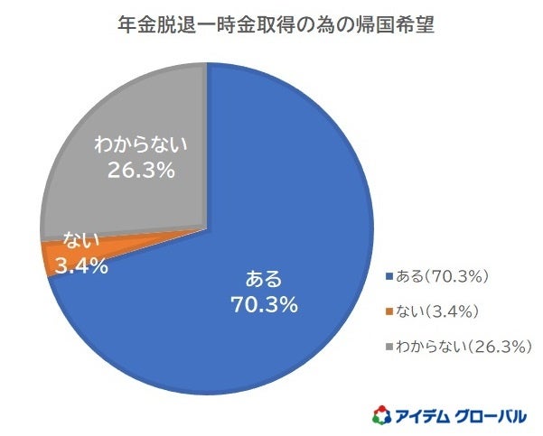 約70%が「年金脱退一時金のための帰国希望あり」と回答している。短期在留外国人における年金脱退一時金の支給上限が5年のため、技能実習2号修了時(3年経過)から特定技能での就労が2年になるタイミングまでで退職・一時帰国し手続きを希望する方も多い。このことから、受入企業の調整と配慮が求められる。