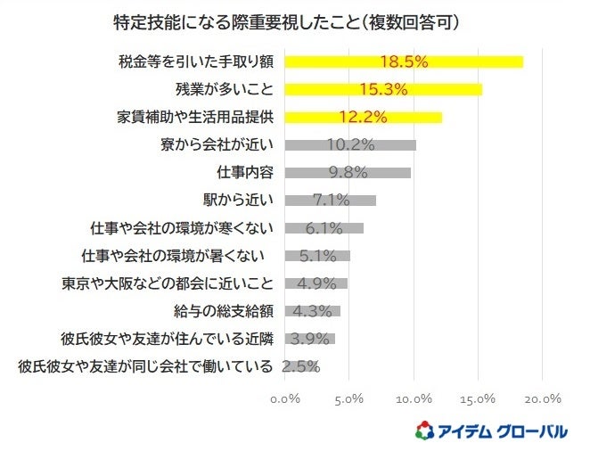 税金等を引いた手取り額18.5%、残業が多いこと15.3%、家賃補助や生活用品提供12.2%