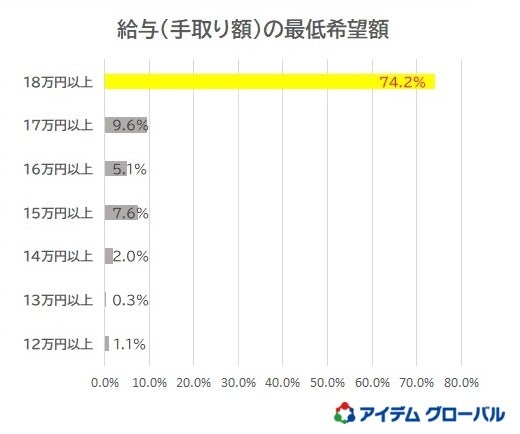 約75%が180,000円以上の手取り額を希望しており、社会保険・税金・家賃などの控除額を鑑みた給与設定が必要になる。