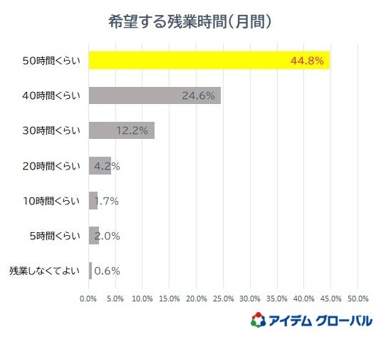 特定技能人材はより多く稼ぎたい希望傾向があり、44.8%が50時間くらいと回答した。面接の場でも残業時間について質問していることが多く見受けられる(残業時間が多い求人に人気がある)。