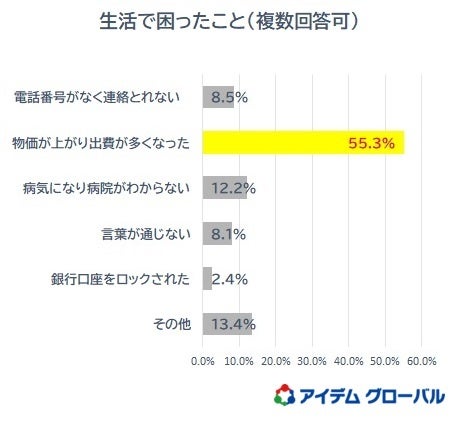 生活で困ったことを聞いたところ、「物価が上がり出費が多くなった」が最多で55.3%、次いで「病気になり病院が分からない」12.2%となった。物価上昇による出費増加が5割を超え、急激な物価上昇の影響が外国人材にも及んでいることが分かる。外国人材の多くは、母国にいる家族の家計を支えていることもあり物価高は死活問題となっている。
