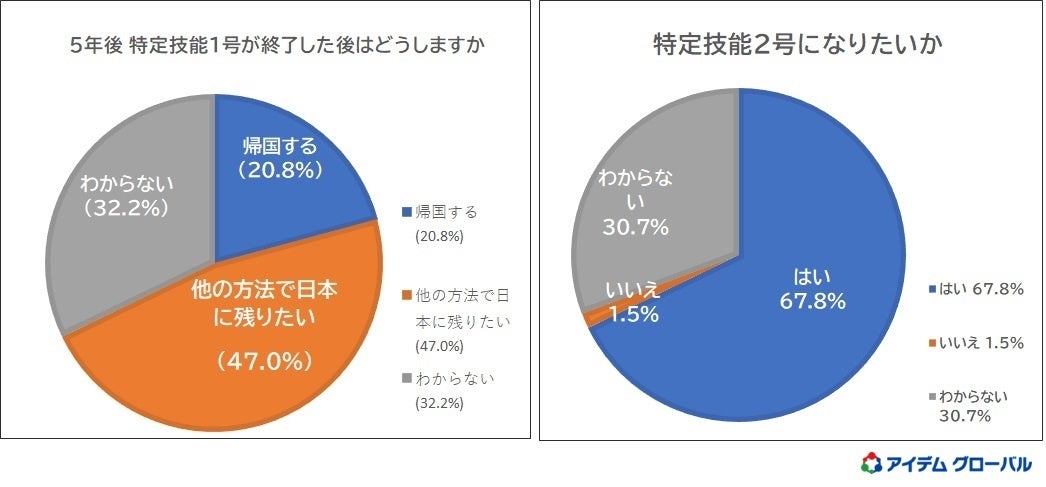 約半数の47%が「他の方法で日本に残りたい」と回答している。また、特定技能2号への希望を聞いたところ68%もの特定技能1号の人材が2号になりたいと回答しており、期待度は高いことが伺える。 特定技能は2019年に開始した制度で4年目に入っている人材もいるため早期の発表が待たれる。