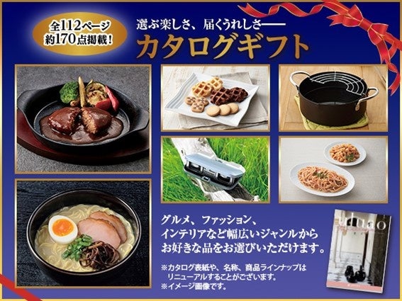 「カタログギフト」にはグルメ、ファッション、インテリアなど、様々なジャンルの品を約170点掲載。付属のはがきからお好きな品をお申込みいただけます。