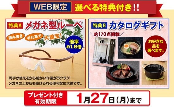 1月27日(月)までのキャンペーン期間中にWEBサイトからお申込みいただきますと、本セットにお付けするプレゼントを「メガネ型ルーペ」か「カタログギフト」のいずれかひとつ、お選びいただけます。