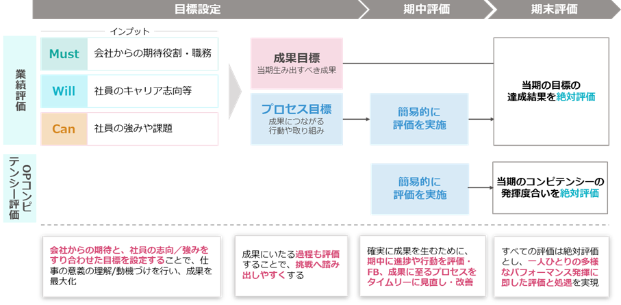 評価制度では、社員の「より自律的な行動」を促すため、半期目標設定時のMust/Will/Canのすり合わせによる組織目標の自分事化や、グループ基本理念「OUR PHILOSOPHY(OP)」に基づいたコンピテンシー評価を導入します。