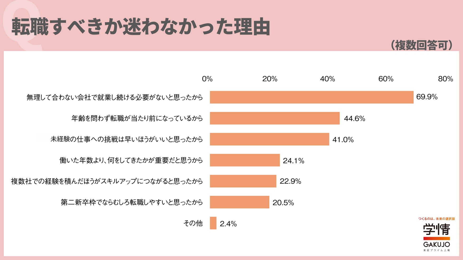 転職すべきか迷わなかった理由は、「無理して合わない会社で就業し続ける必要がないと思ったから」が69.9%で最多。次いで、「年齢を問わず転職が当たり前になっているから」44.6%、「未経験の仕事への挑戦は早いほうがいいと思ったから」41.0%が続きました。