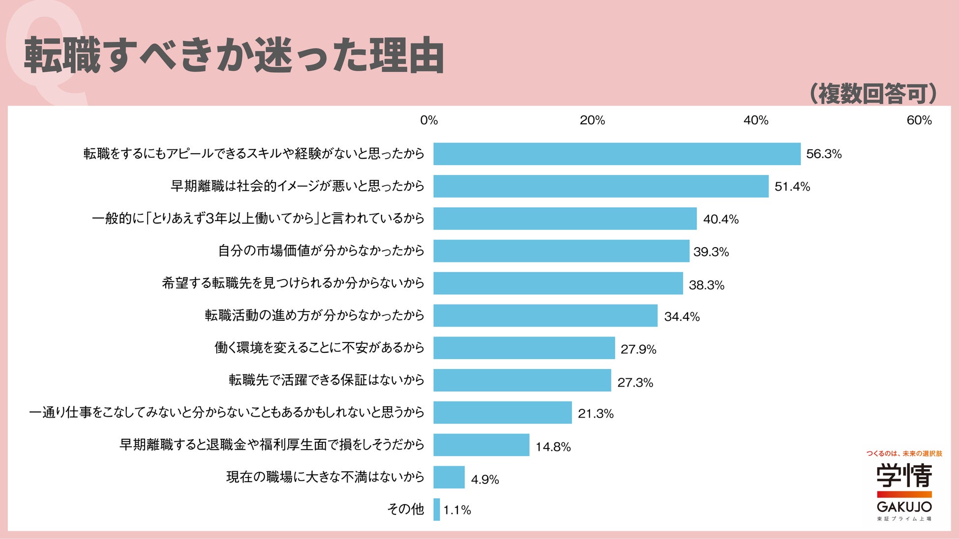転職すべきか迷った理由は、「転職するにもアピールできるスキルや経験がないと思ったから」が56.3%で最多。次いで、「早期離職は社会的なイメージが悪いと思ったから」51.4%、「一般的に『とりあえず3年以上働いてから』と言われているから」40.4%が続きました。転職すべきか迷う20代は、新卒で入社した企業で一定期間働くことが必要だと考えていることがうかがえます。