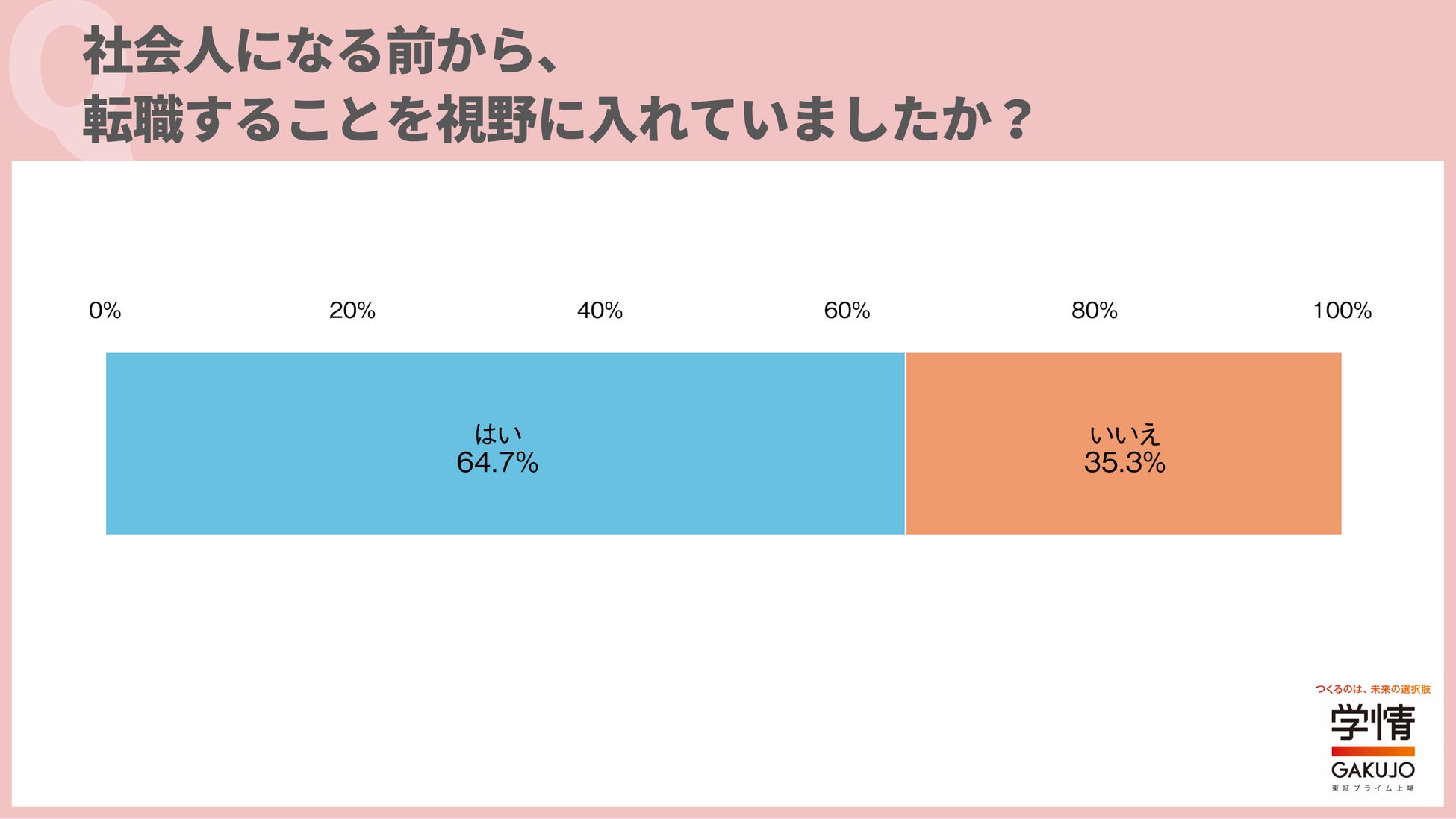 「社会人になる前から、転職を視野に入れていた」と回答した20代が64.7%に上りました。6割を超える20代が、社会人になる前から転職をキャリアの選択肢にしていたことが分かります。