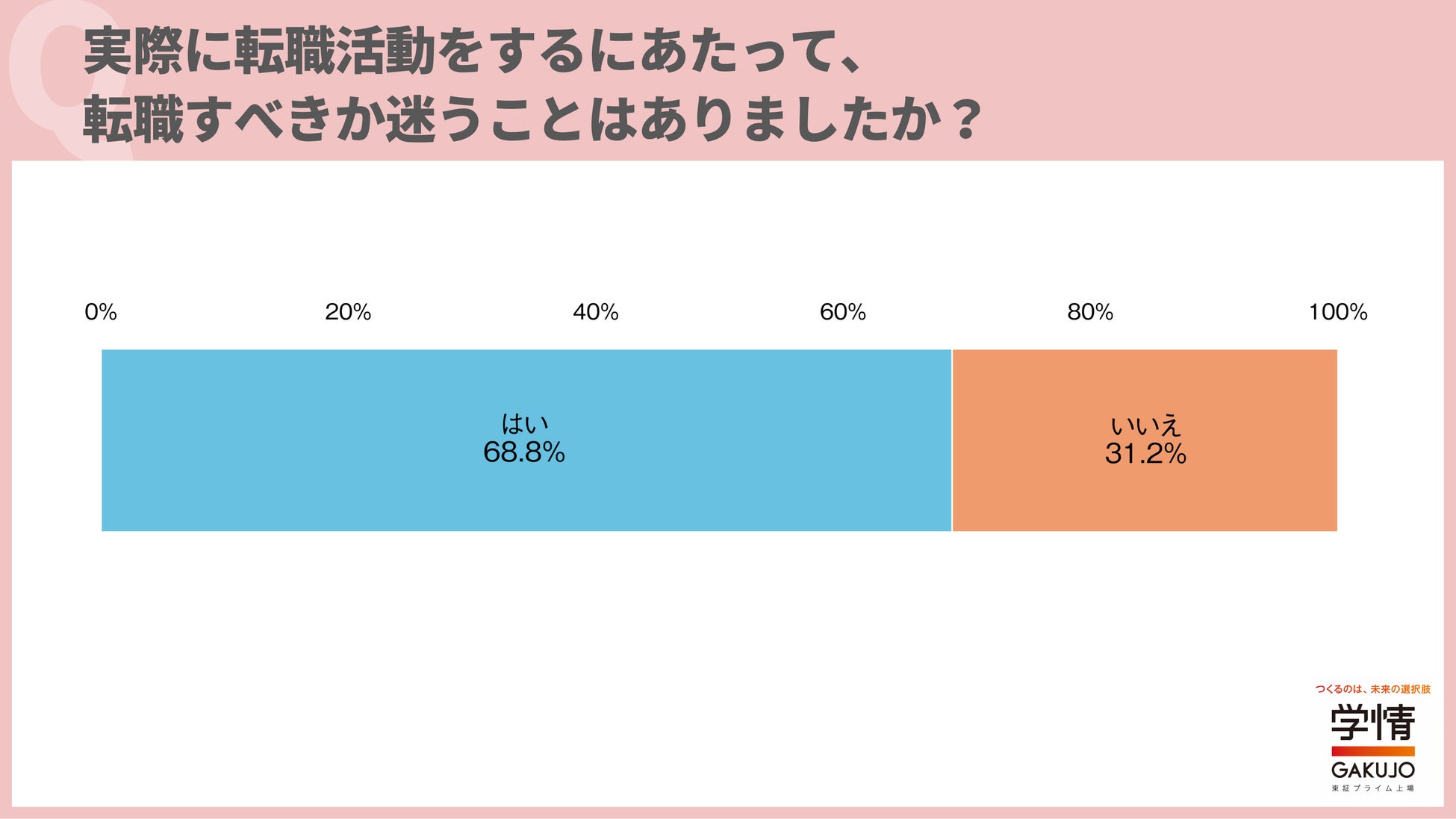 「転職活動をするにあたって、転職すべきか迷うことがあった」と回答した20代が68.8%に上りました。約7割の20代が転職活動において、実際に転職するか迷う経験をしていることが分かります。「迷うことはなかった」と回答した20代は、31.2%でした。