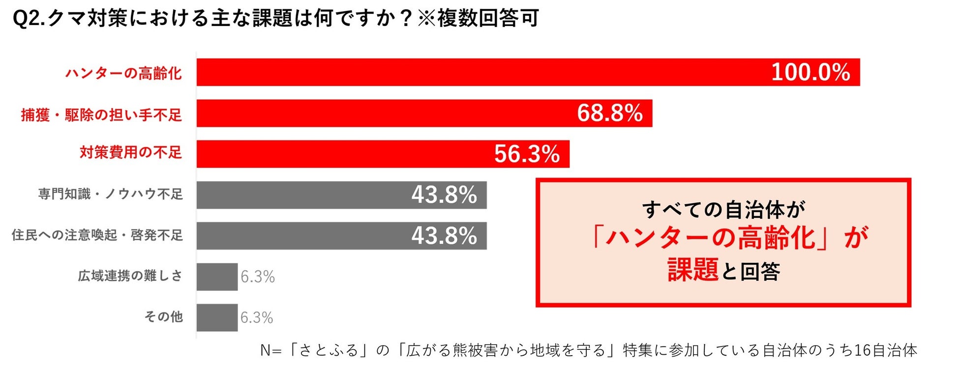 クマ対策における主な課題としては、「ハンターの高齢化」が100%(16自治体)と最も多く、次いで「捕獲・駆除の担い手不足」(68.8%)、「対策費用の不足」(56.3%)が続きました。人材不足と財源確保が、対策推進における課題となっている実態が浮き彫りとなりました。