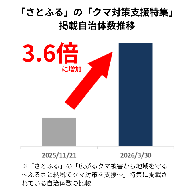 ふるさと納税ポータルサイト「さとふる」を運営する株式会社さとふる(本社:東京都中央区、代表取締役社長 兼 CEO:藤井 宏明)は、全国で相次ぐクマの目撃・被害報道を受け、自治体と連携して開設したクマ被害対策支援特集ページの取り組みと、寄付の広がりについて紹介します。