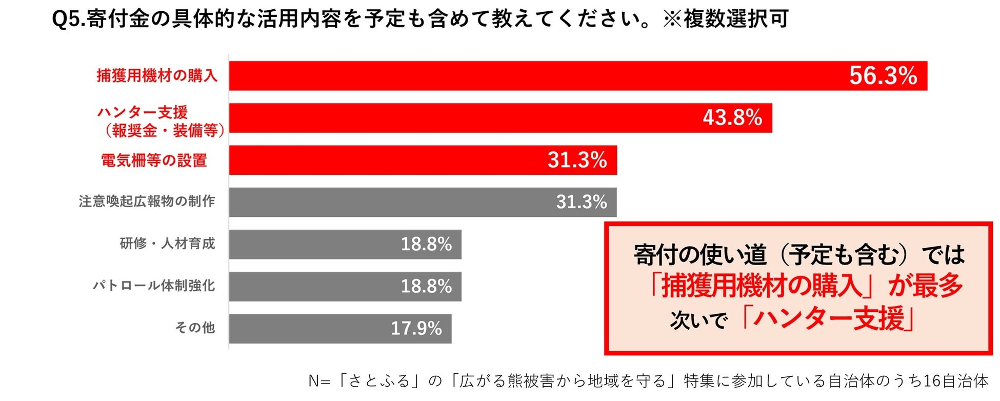 寄付金の具体的な活用内容(予定含む)としては、「捕獲用機材の購入」(56.3%)が最も多く、次いで「ハンター支援(報奨金・装備等)」(43.8%)、「注意喚起広報物の制作」(31.3%)、「電気柵等の設置」(31.3%)などが挙げられました。