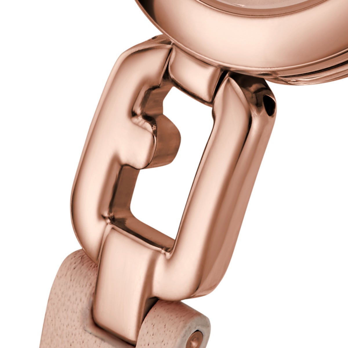 時計本体とイタリアンレザー製ストラップとの接合部にはアイコニックなフルラのアーチロゴを配し、クラフツマンシップと女性に相応しいシルエットとデザインを兼ね備えています。